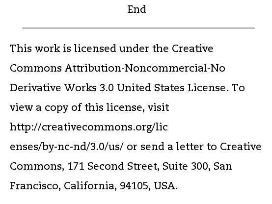 This work is licensed under the Creative Commons Attribution-Noncommercial-No Derivative Works 3.0 United States License. To view a copy of this license, visit http://creativecommons.org/licenses/by-nc-nd/3.0/us/ or send a letter to Creative Commons, 171 Second Street, Suite 300, San Francisco, California, 94105, USA.