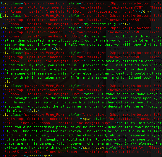 As you can see, the main goal of the first pass is to get the body text into properly opened/closed paragraph tags (<p></p>). This tells the Mobipocket renderer where a paragraph begins and ends, so that it can indent each paragraph and space it from the others appropriately.