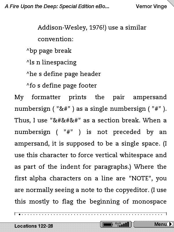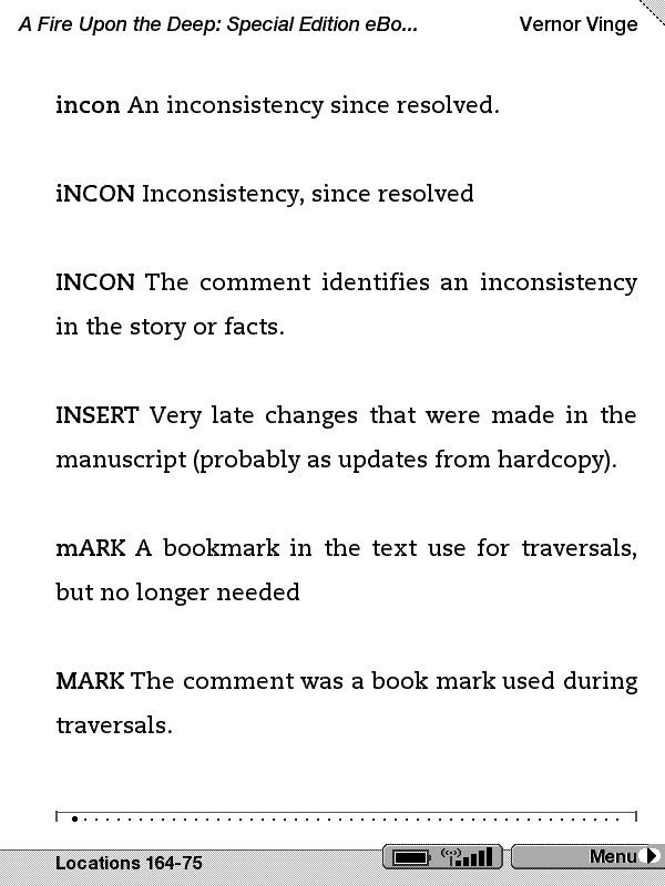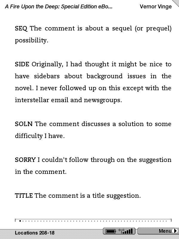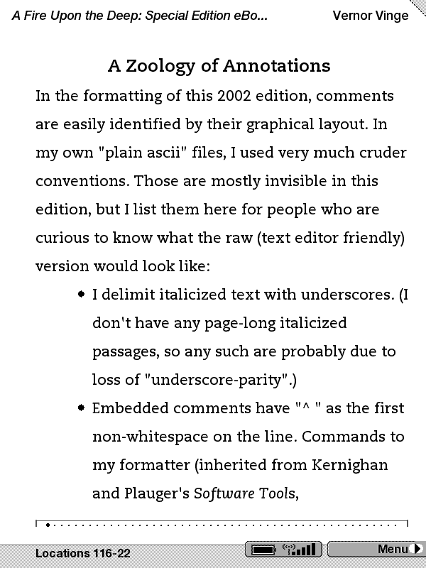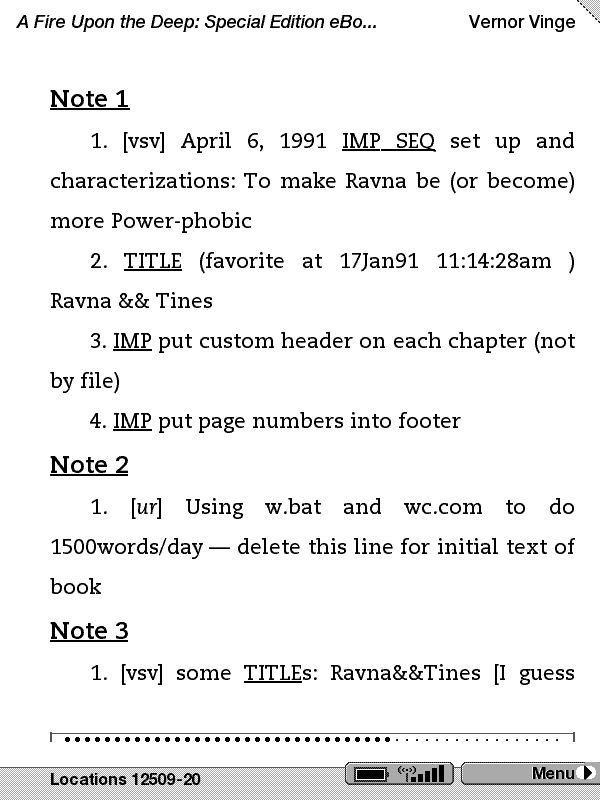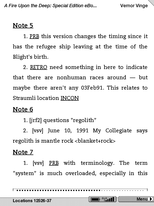 As a result, when you go about making a special edition of one of Vernor Vinge’s Hugo Award winning works, you have a lot of material to work with. Maybe a bit too much. If we were talking about a paper book, there’d be so many footnotes scattered about that either they’d need to stack at the end of chapters or, heavens forbid, the end of the book in one big mess. The alternative is to stack the notes up at the bottom of the text, which is disturbing in its own way, though this method preserves locality of reference to a single page.