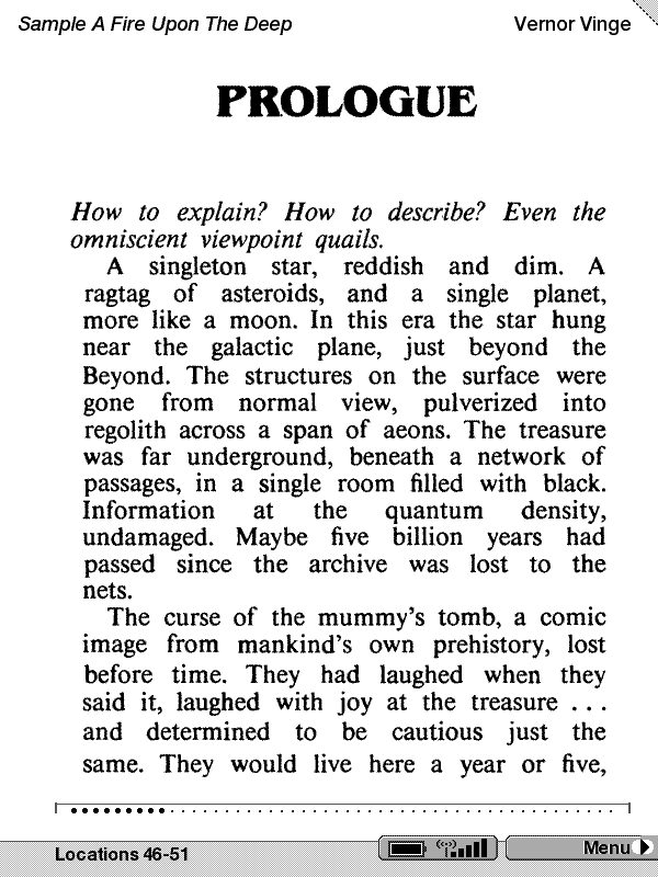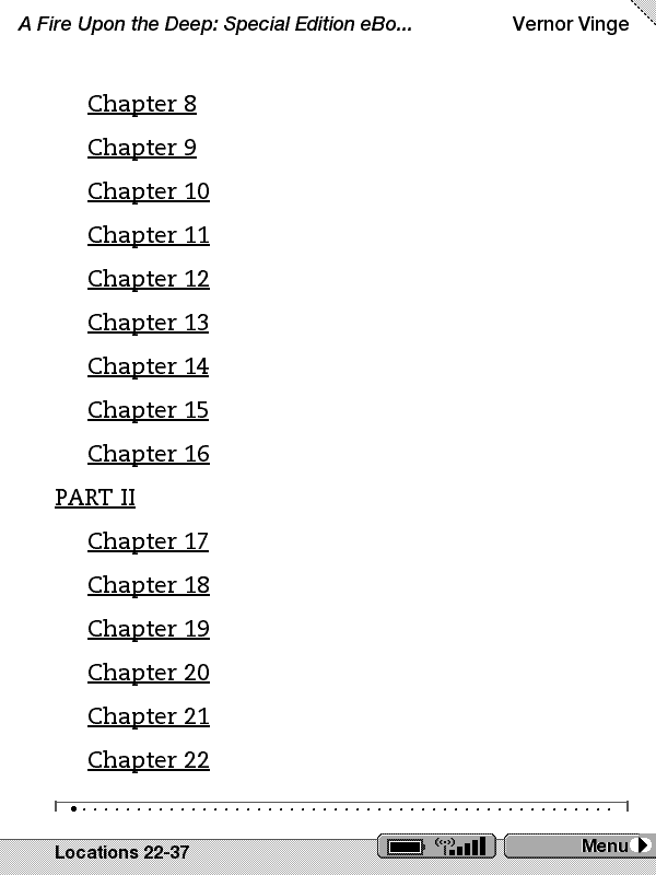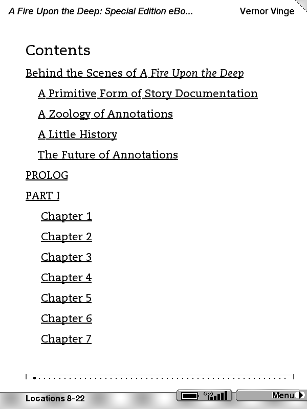 It turns out that whoever assembled the special edition of A Fire Upon the Deep is an eBook maker after my own heart. I’ve discussed the interesting aspects of putting the Shadow Unit Season One eBook together here and here, as it’s a hyper-linked work.