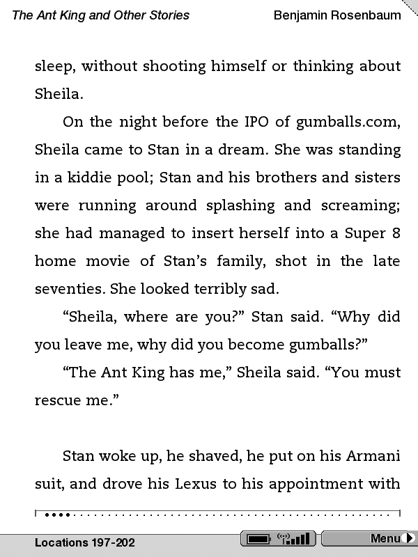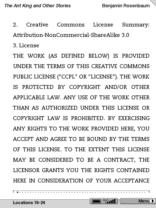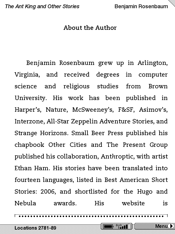 I also emailed Benjamin for permission (I don’t have to, but I prefer to, anyways) and he thought this was nice, and has forwarded the file so that Small Beer Press can post it on their CC download page for The Ant King (they’ve also got quite a few other CC works there. I’ll have to check them all out!). When they do this, I’ll remove the download link for the Mobipocket on this blog post and repoint to their site.