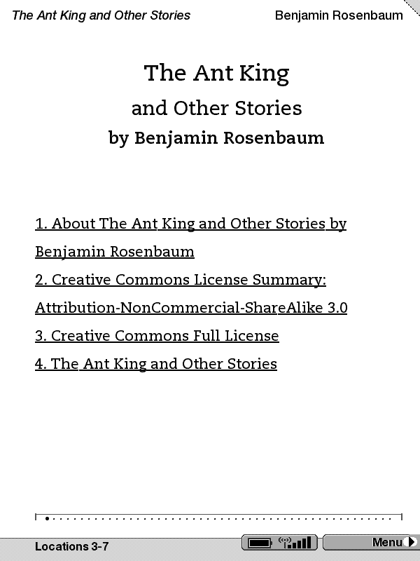 I can do this and distribute it because The Ant King and Other Stories is under the Creative Commons Attribution-Noncommercial-Share Alike 3.0 license. The eBook I created is also released under the same license.